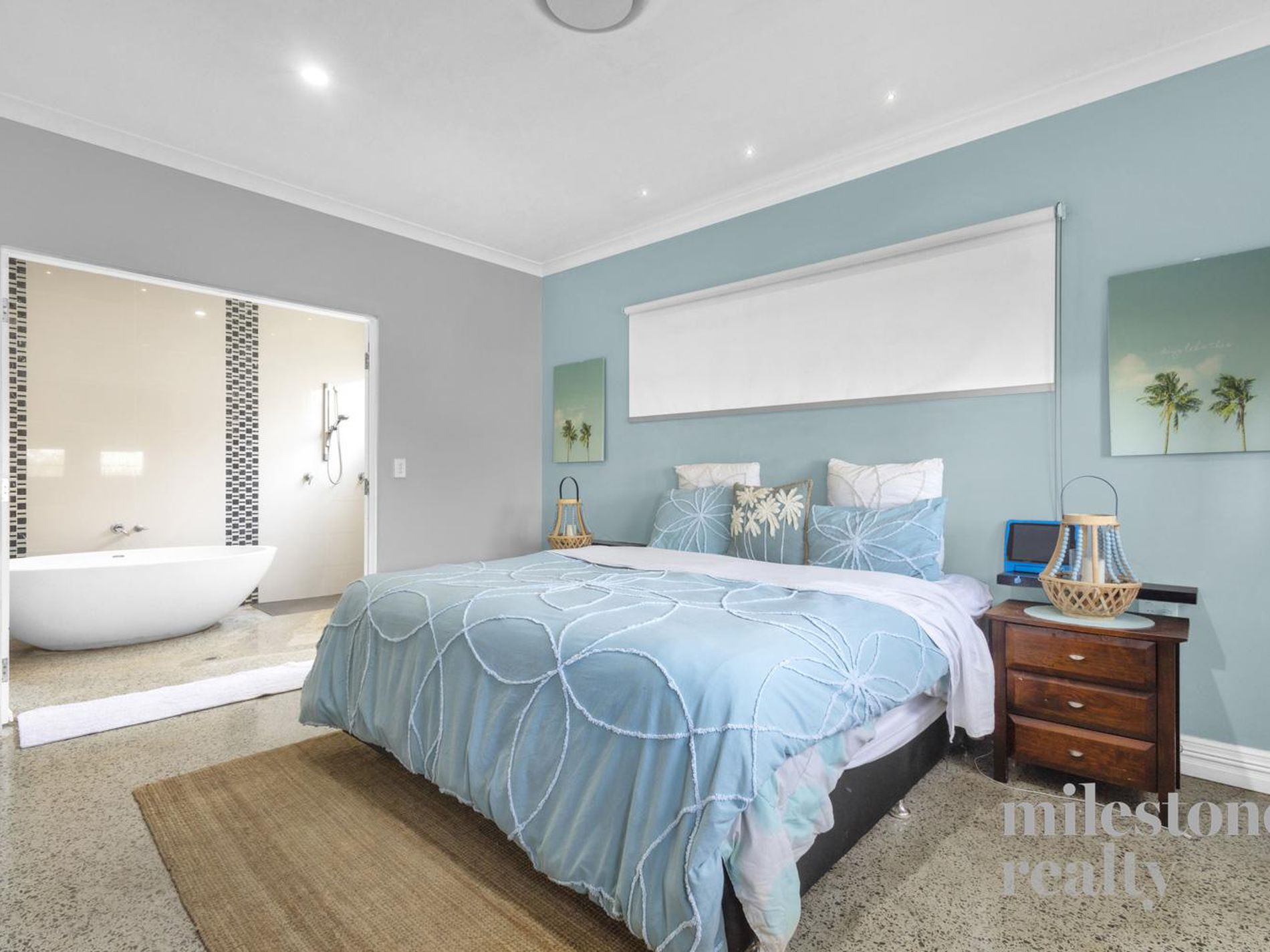 King-size primary suite with custom robes and hotel-style ensuite featuring a freestanding bath.