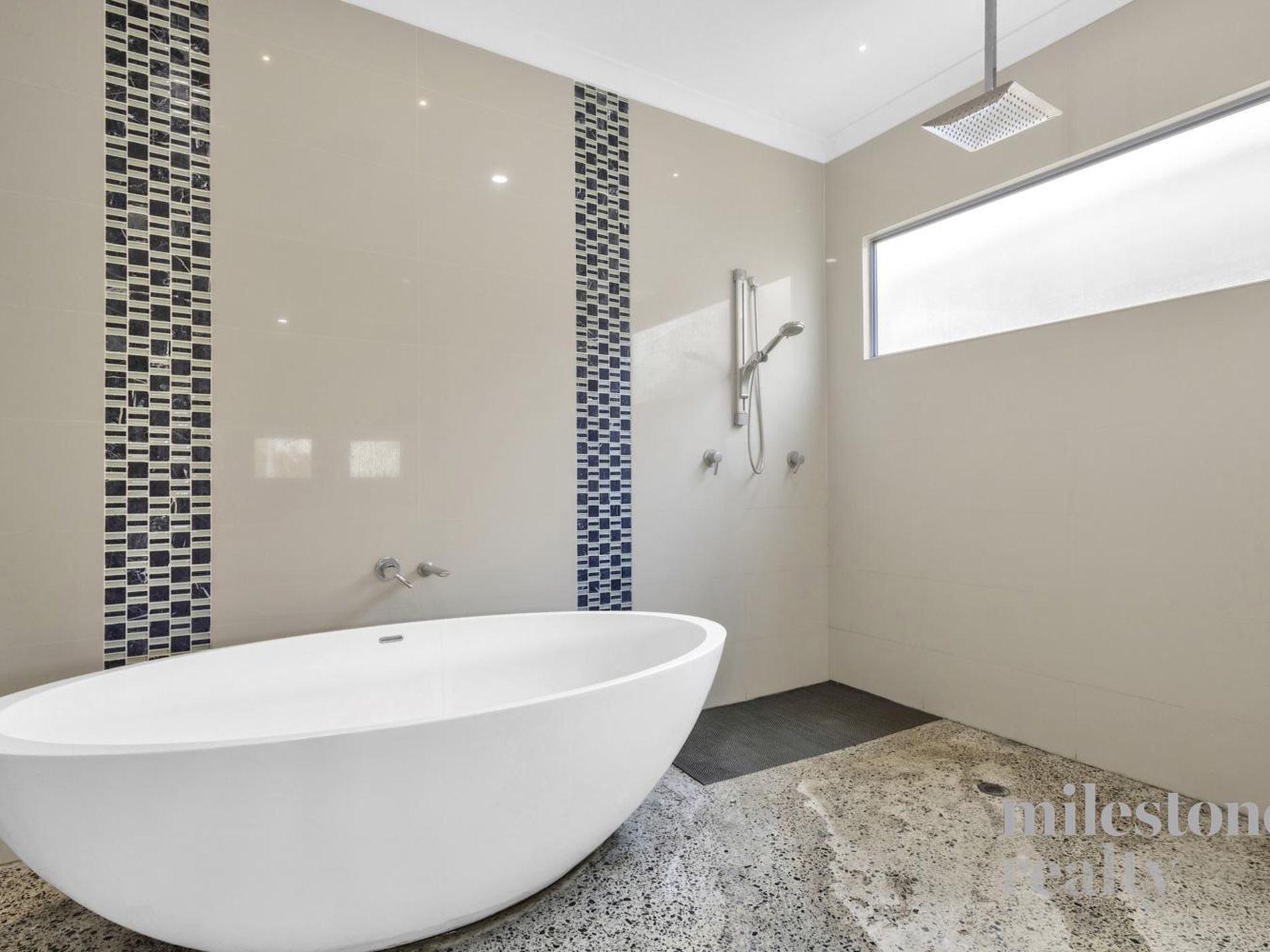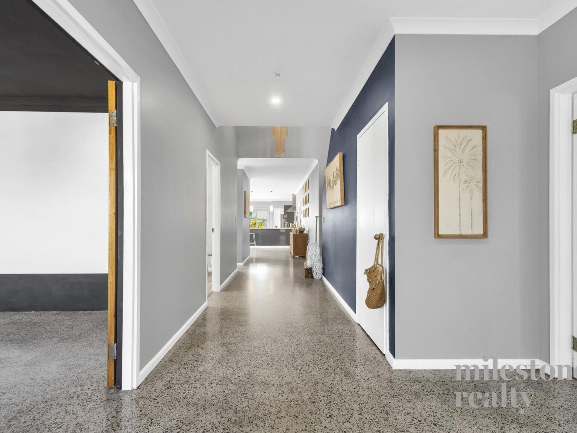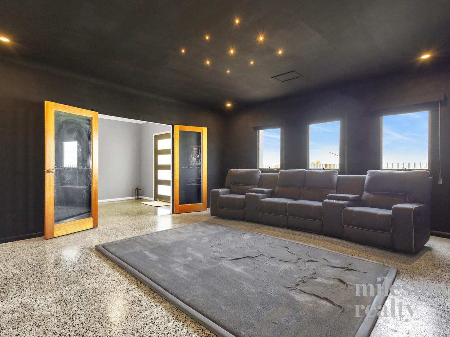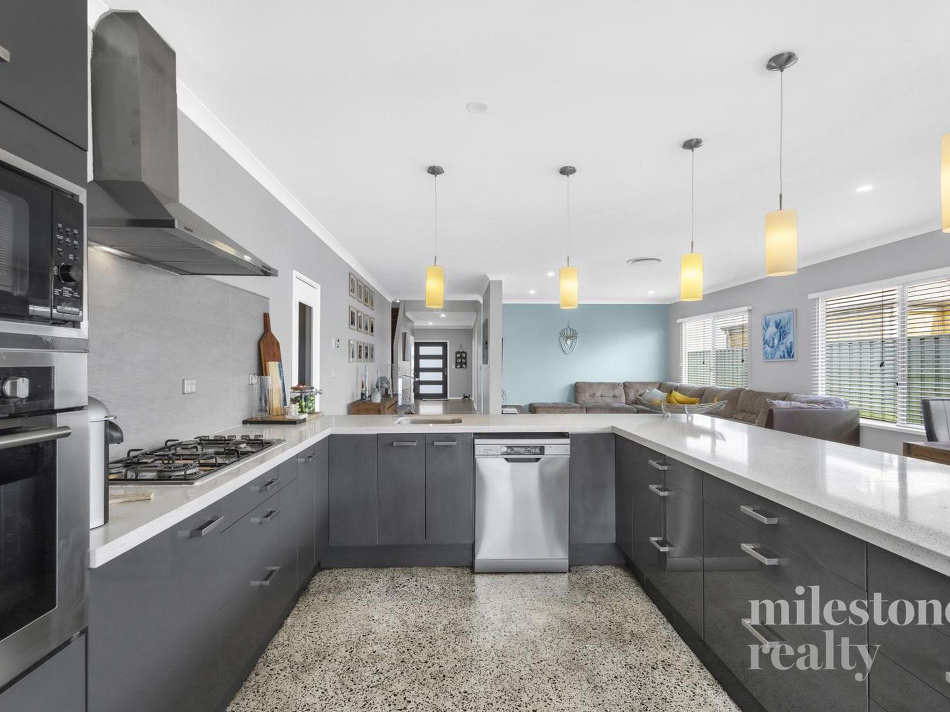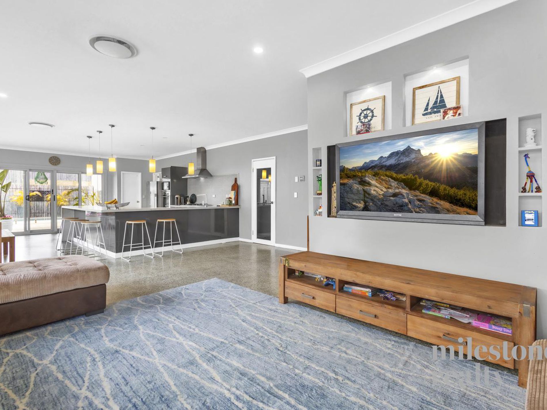 Expansive open-plan living with contemporary polished concrete floors flowing to alfresco.