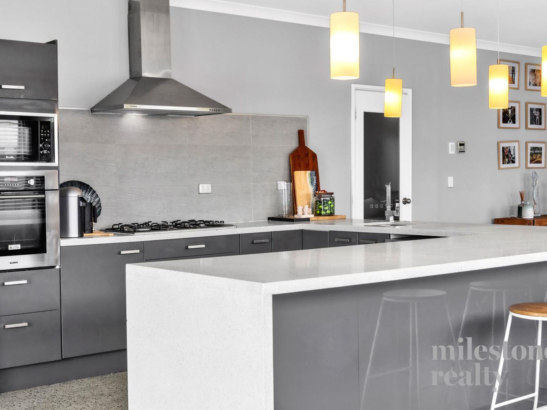 Chef's kitchen: stone bench tops, breakfast bar, double fridge recess (plumbed), stainless appliances, walk-in pantry.